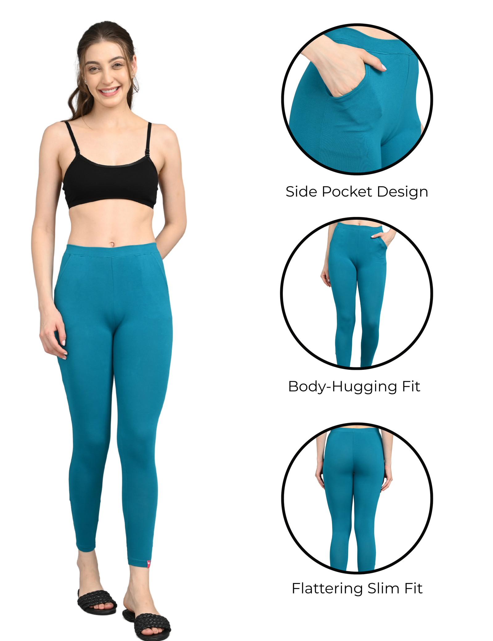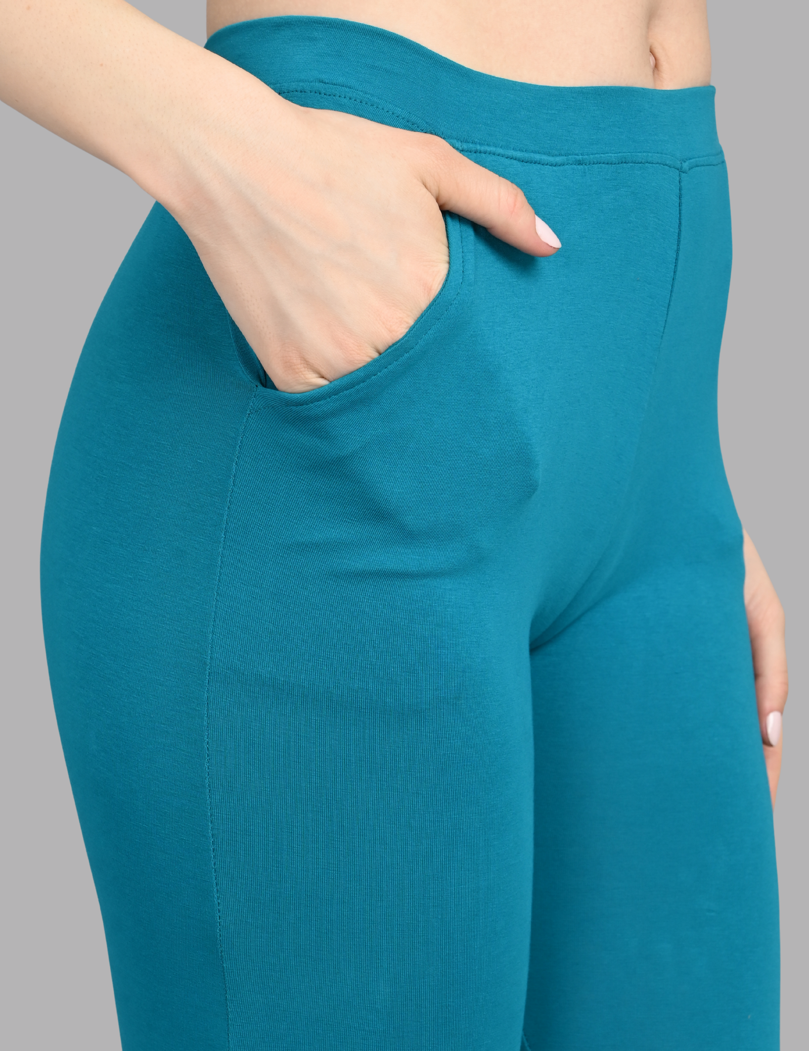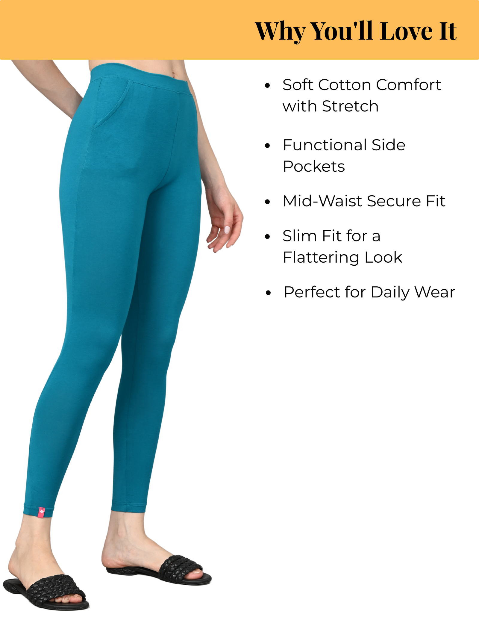 Cotton Leggings for Women with Pockets | Mid Waist | Slim Fit | Stretchable Everyday Wear | Blue
