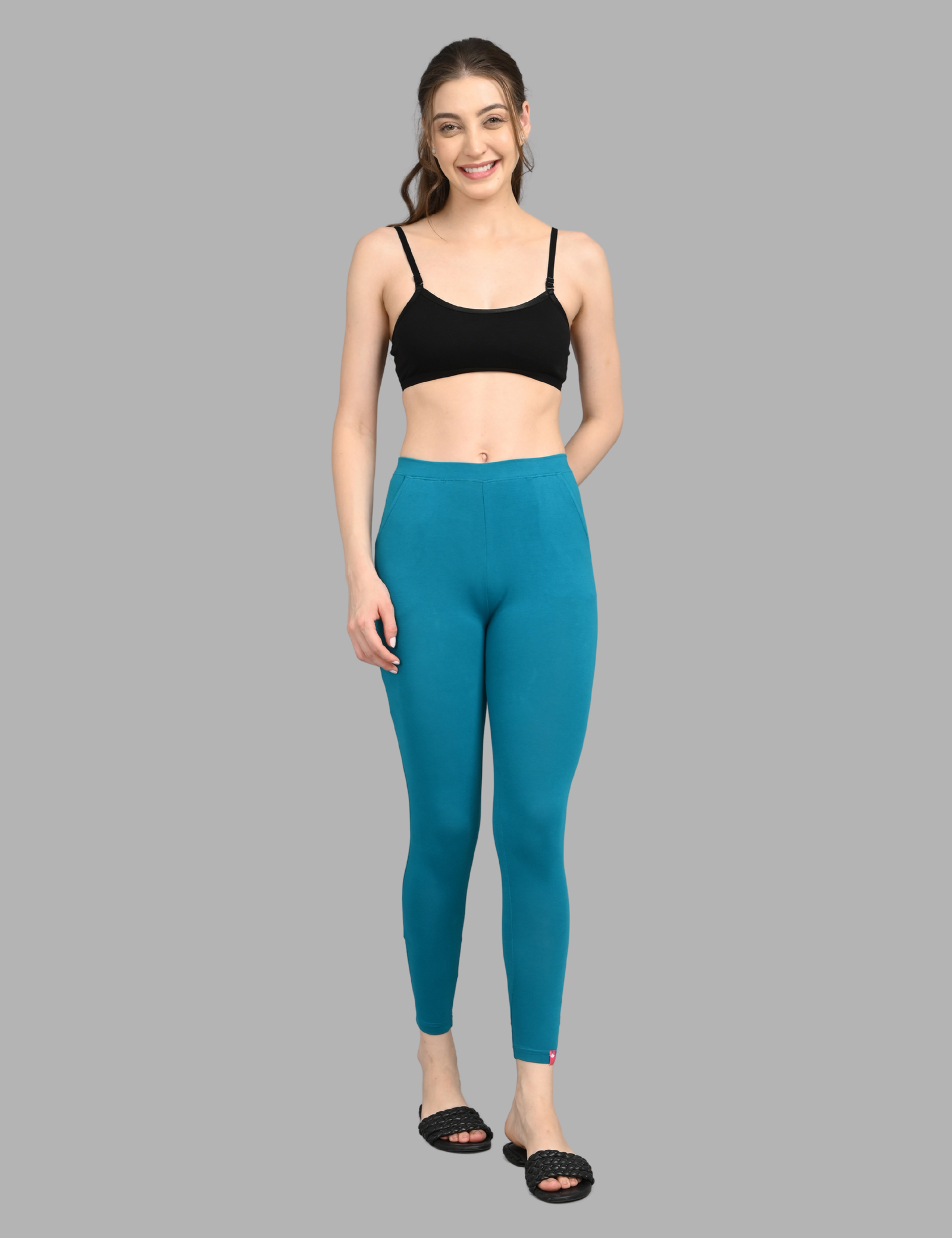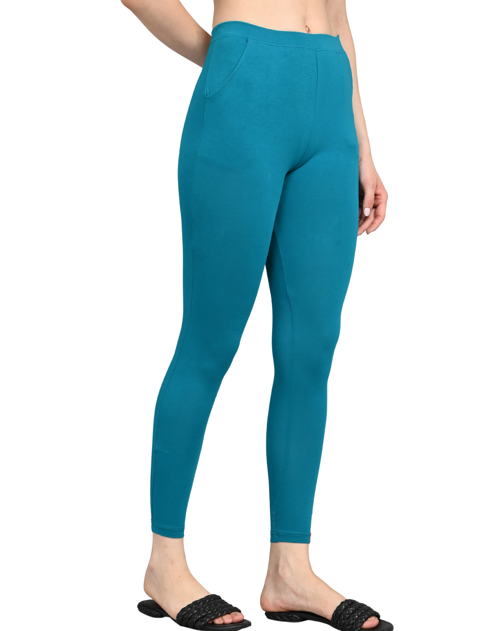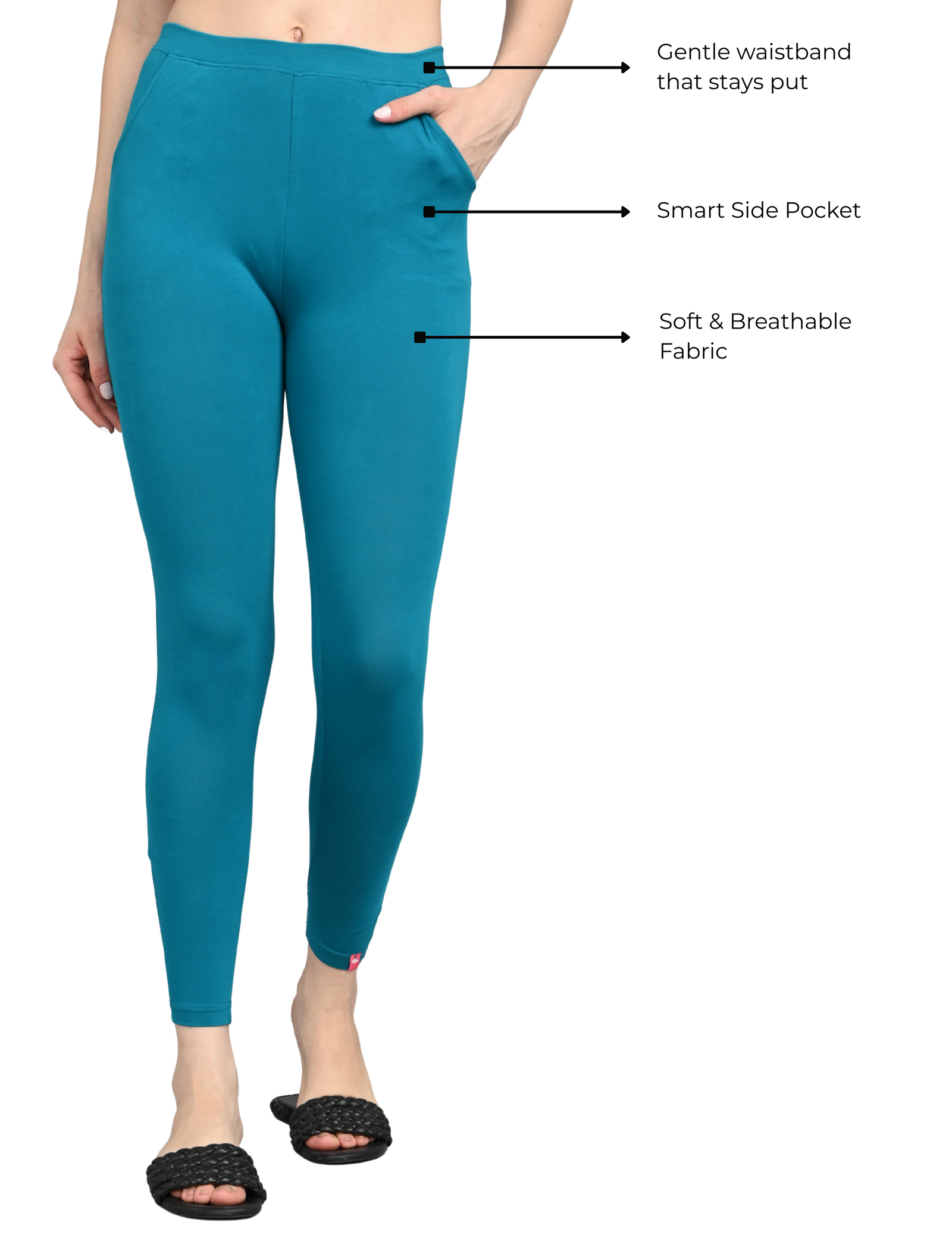 Cotton Leggings for Women with Pockets | Mid Waist | Slim Fit | Stretchable Everyday Wear | Blue